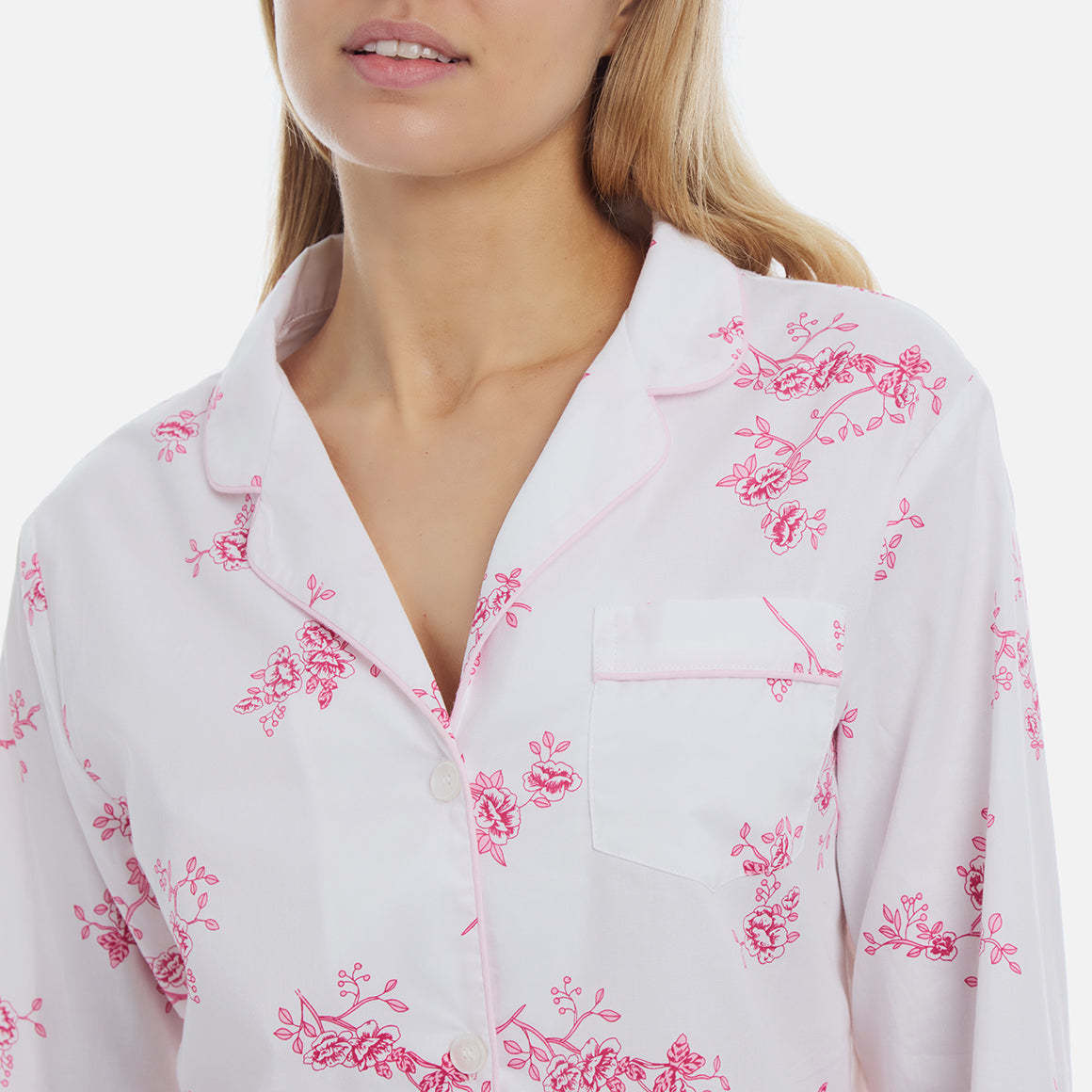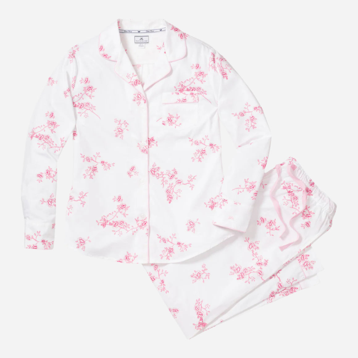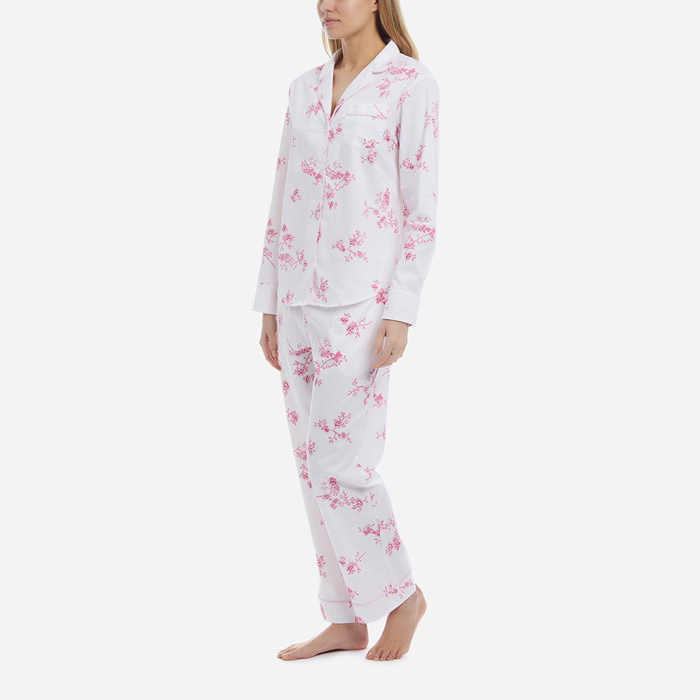 This delicate, vintage print evokes memories of spring mornings and the roses climbing up the arbors. This classic pajama set is accented with pink piping and finished with pearl buttons.