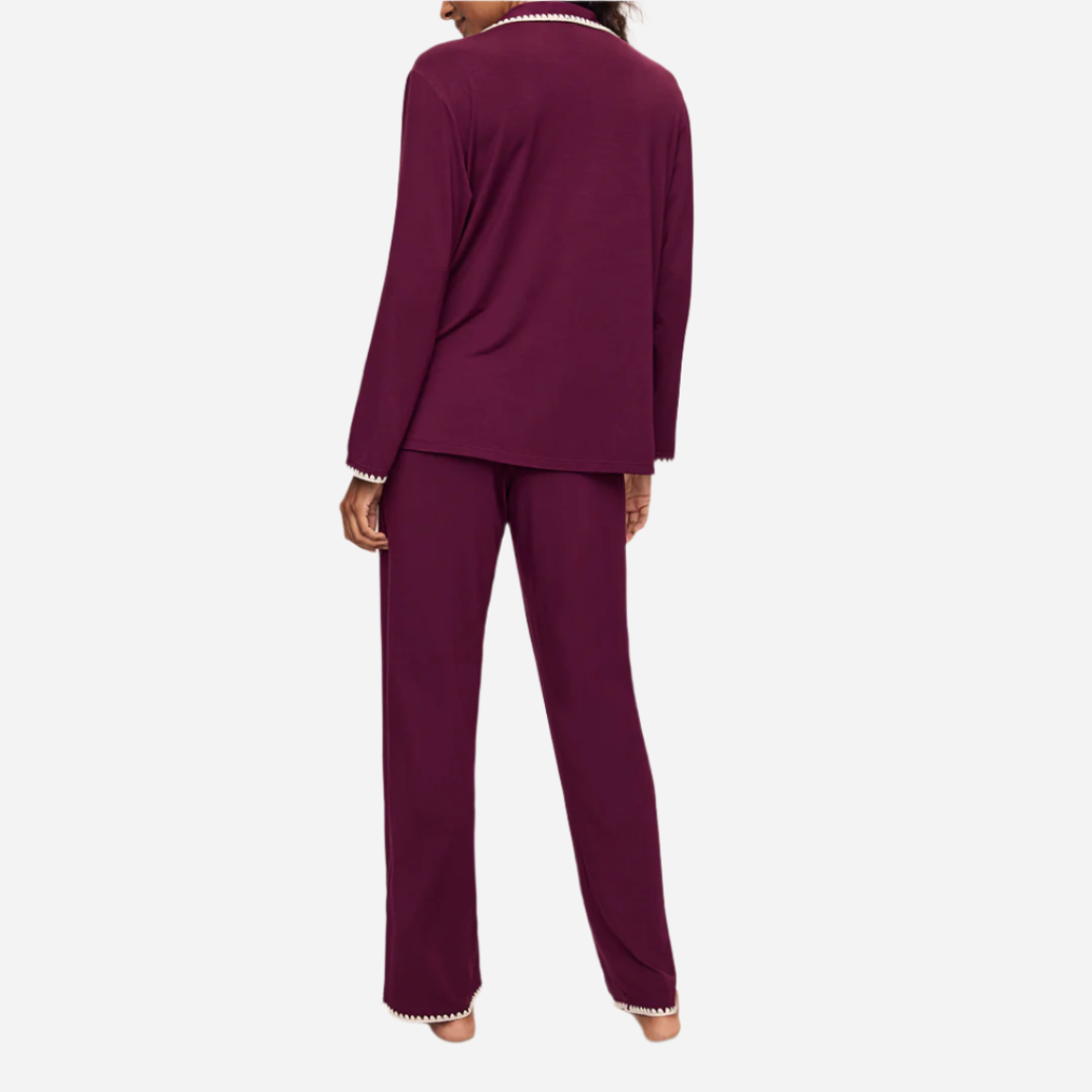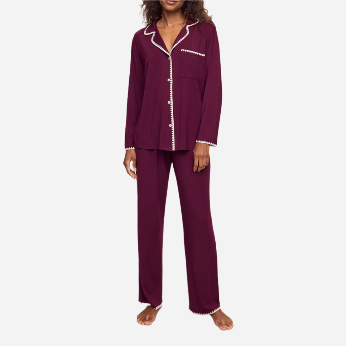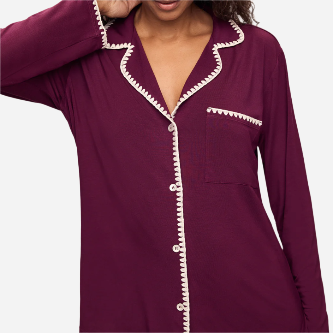 For the one who appreciates the details. Made from TENCEL™ Modal fibers and a touch of spandex, this buttery soft fabric is verified by OEKO-TEX® Standard 100, meaning it’s dyed with safe and non-toxic dyes. This artisanal whipstitched set features a relaxed long sleeve button front top with a notch collar and functional pocket while the low-rise straight leg pant features a thin elastic waistband.