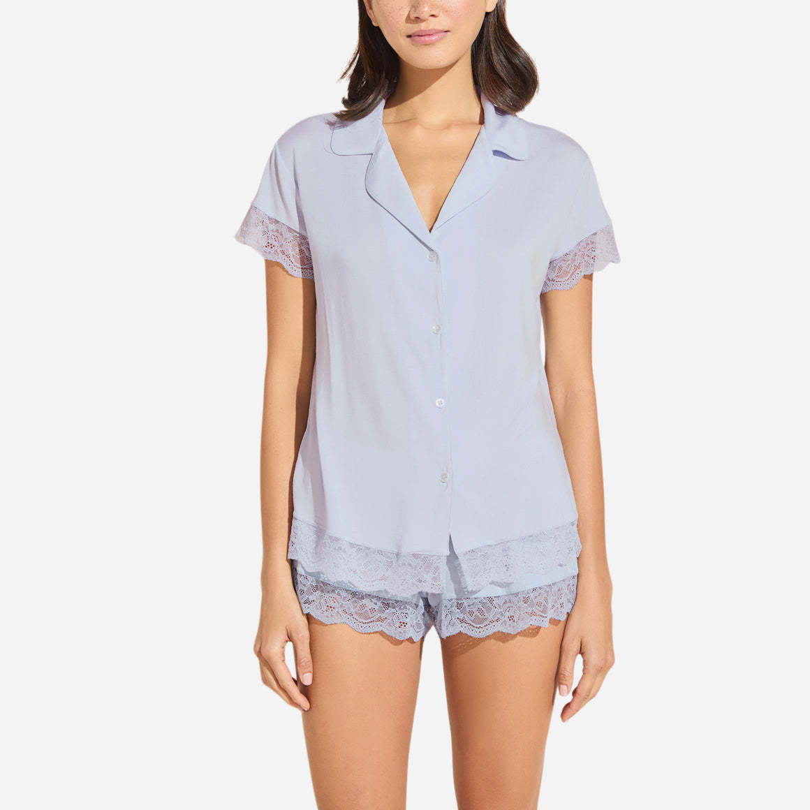 Romanticize your sleep. Made from TENCEL™ Modal fibers and a touch of elastane, this buttery soft fabric is verified by OEKO-TEX® Standard 100, meaning it’s dyed with safe and non-toxic dyes. This set features a short sleeve button front top with notch collar and a low-rise cheeky shot with an elastic waistband.