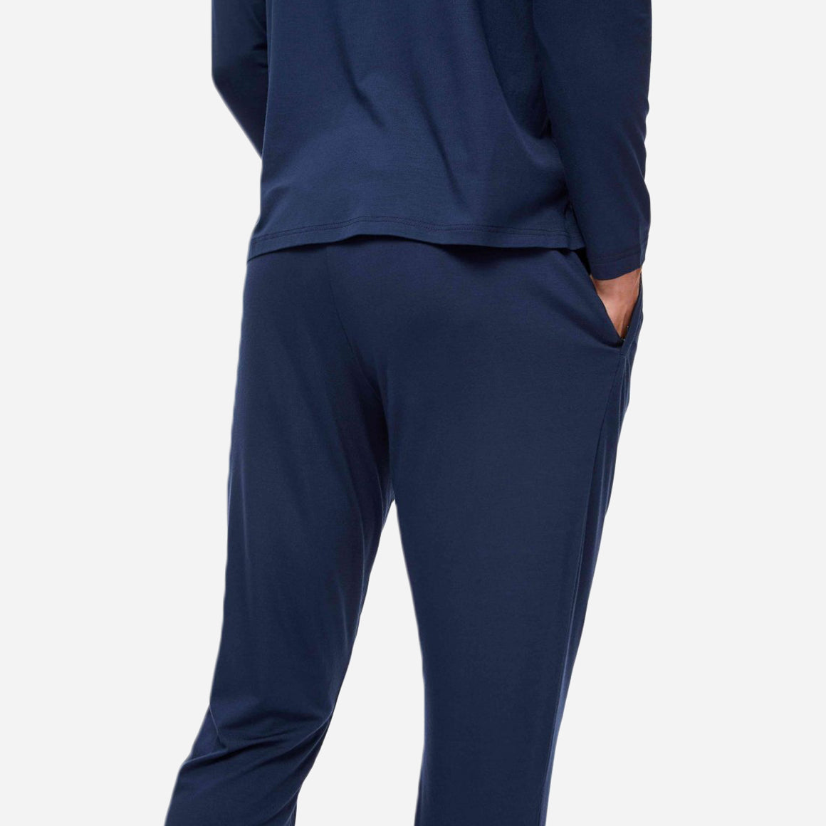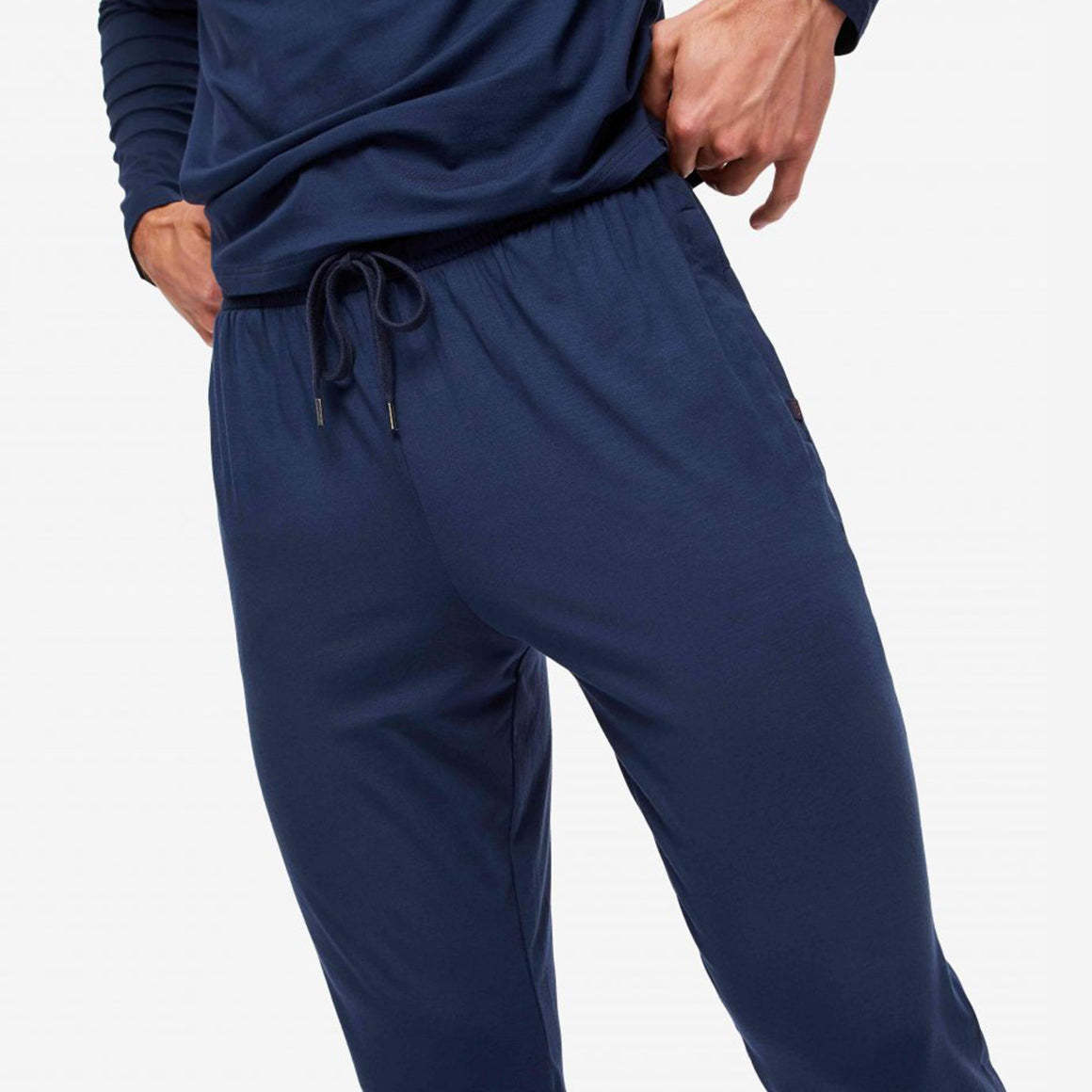 Featuring a comfortable elastic and tie waistband, two front side pockets with concealed pin-lock zips, and cuffed bottoms for a modern look, these sweatpants are both functional and stylish. The navy blue color and flattering fit make them a timeless addition to your loungewear collection.
