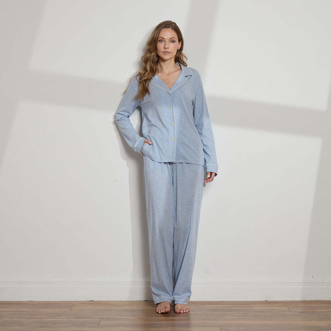 Our long sleeve pajamas feature a relaxed fit and full coverage, ideal for restful nights and lounging at home. The pajama set includes a classic button-up top with a collar. The matching pants feature an elasticated drawstring waist for a personalized fit. Lavishly soft slumbers are within reach.