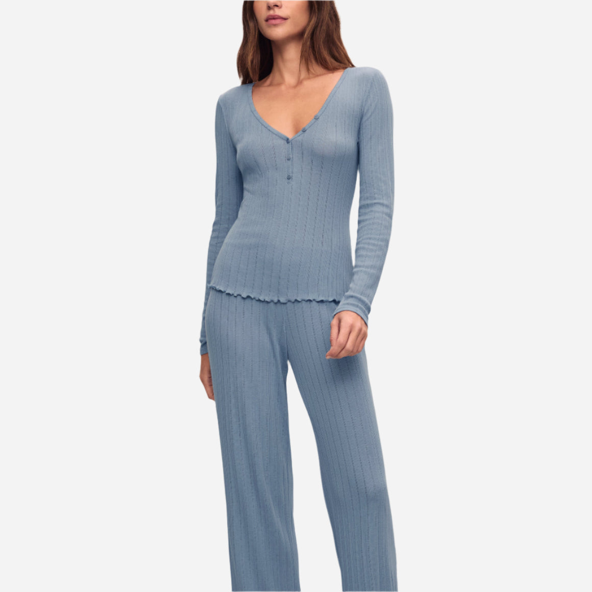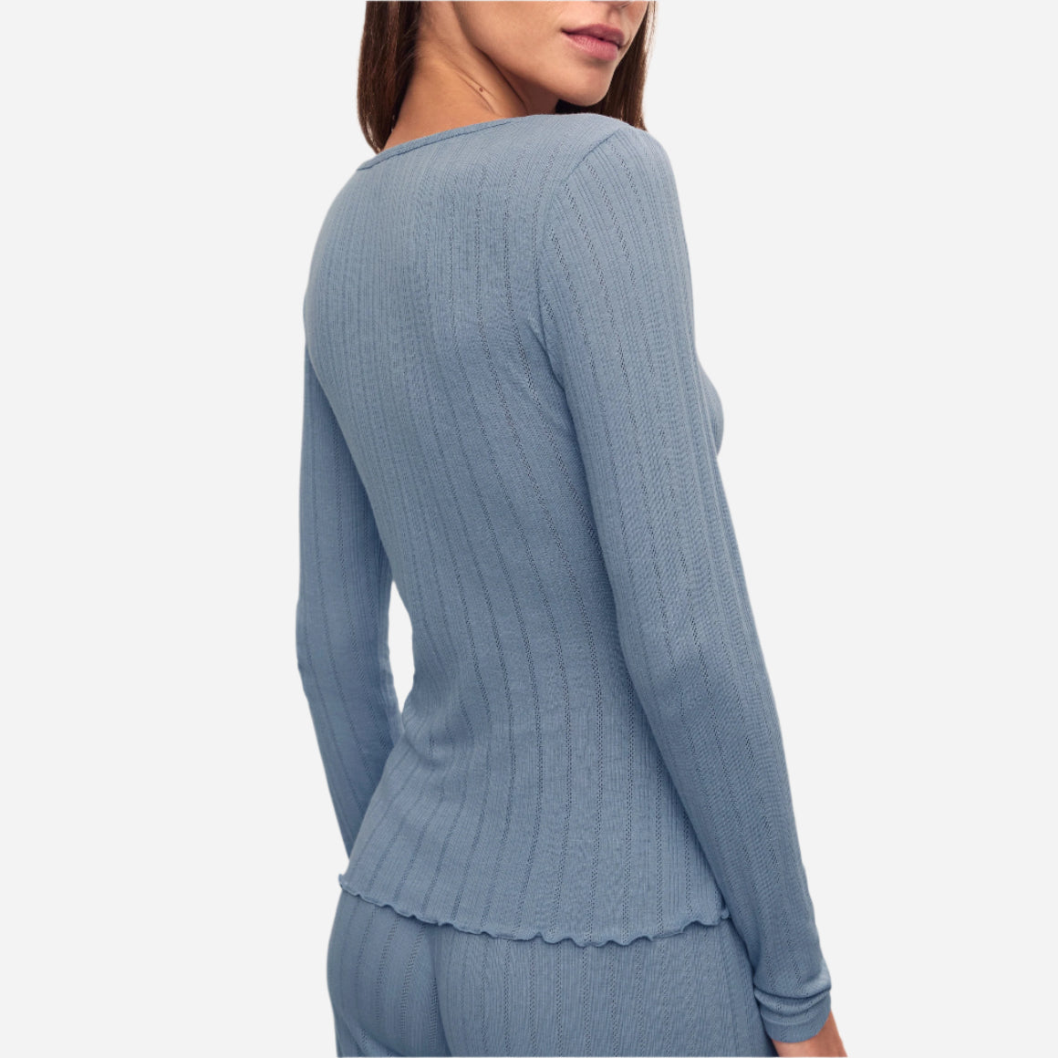Wrap yourself in elegance with our open V-neck long sleeve Henley, complete with natural corozo buttons and a decorative placket for added flair. Its slimmer fit and flattering lettuce edge hem accentuate your silhouette effortlessly.