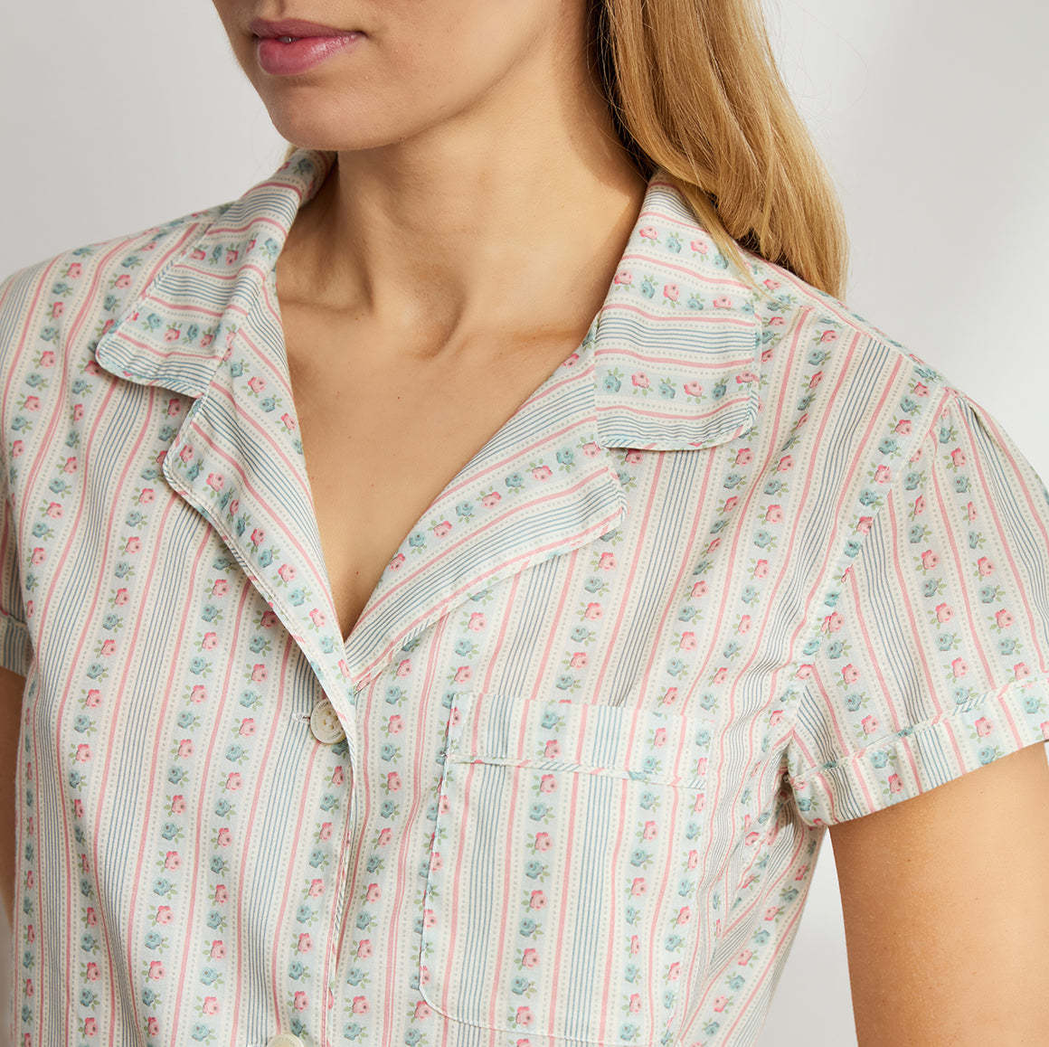 The pajama set includes a classic button-up top with a collar, the matching shorts feature a comfortable elastic waistband, drawstring, and side-seam pockets.