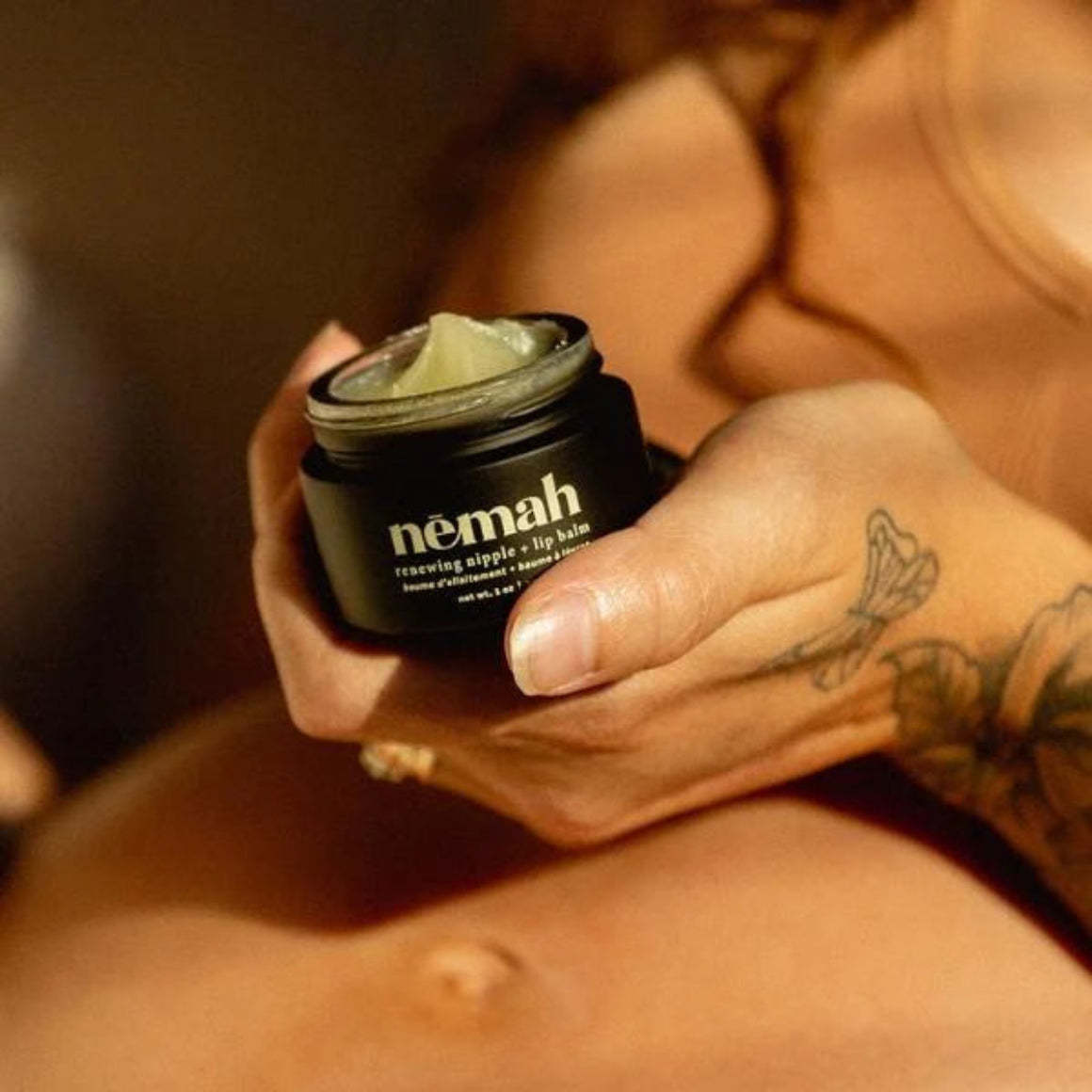 Designed with mamas in mind, Nēmah's Renewing Nipple + Lip Balm provides deep hydration and relief for irritated skin, nipples, and lips. They've crafted this balm with organic botanical ingredients: Jojoba Oil, rich in Vitamins E and B, Calendula helps improve skin hydration and elasticity, Mango Butter, offers long-lasting moisture.