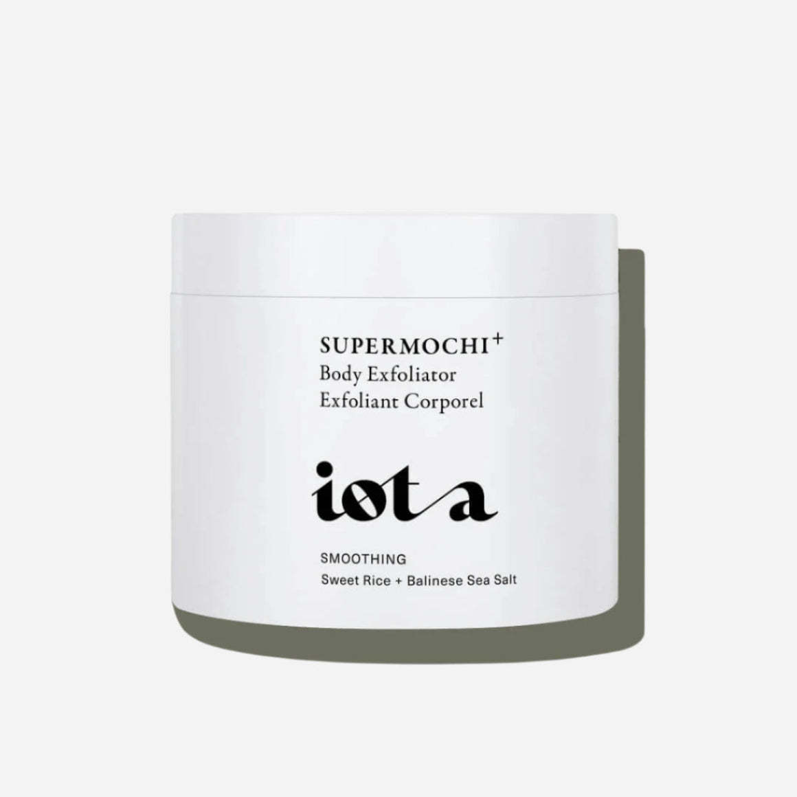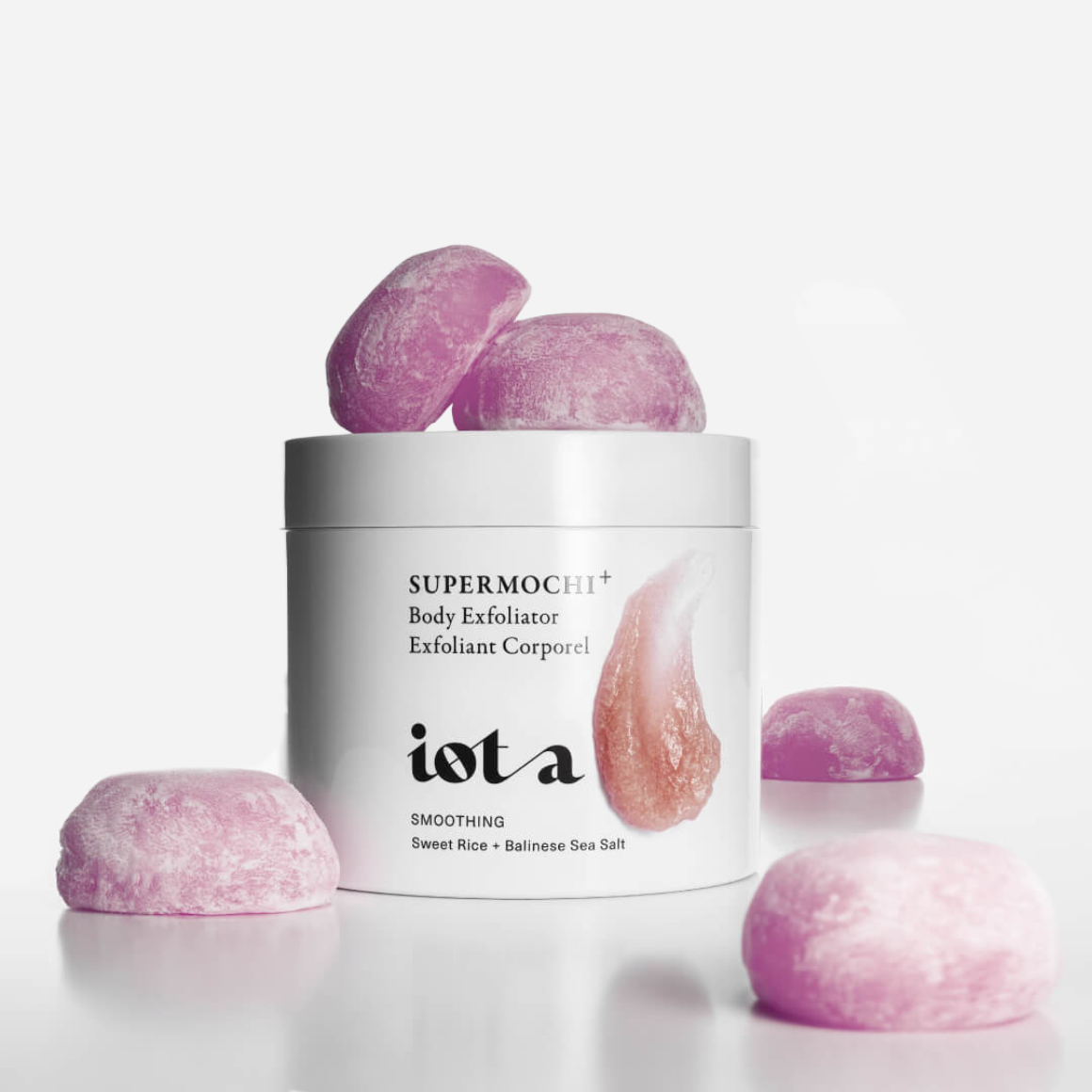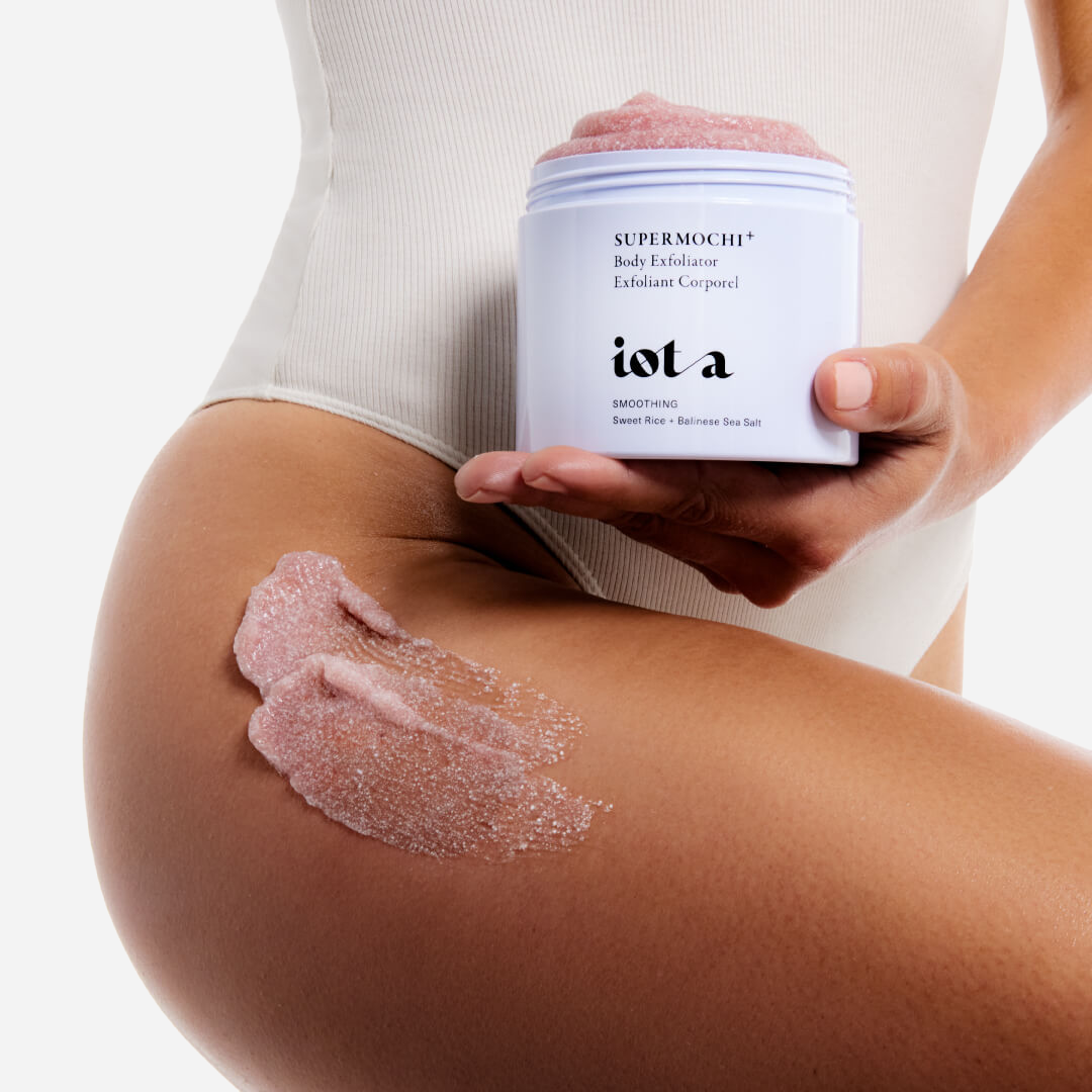 iota's Supermochi Body Exfoliator+ is a next-gen, mochi-textured scrub blending Balinese sea salt, Thai sweet rice, Korean red bean, ube, lactic and hyaluronic acids to gently buff away rough, bumpy skin—perfect for KP, ingrown hairs, and smoothing uneven texture—while transforming into a silky milk as you massage it in.
