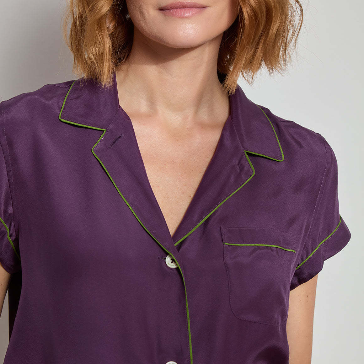 Indulge in luxurious comfort with our women's silk short sleeve pajamas. Made from 100% pure mulberry silk, these pajamas are the epitome of elegance and sophistication. The natural silk charmeuse has a matte finish and the soft drape of the silk fabric creates a dreamy, lightweight feel against your skin. In addition to style and comfort, silk also offers health benefits. The natural properties of silk help regulate body temperature, keeping you cool in the summer and warm in the winter. It is also hypoallergenic, making it an ideal choice for those with sensitive skin or allergies.